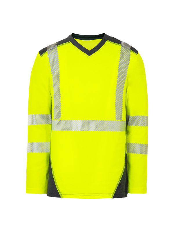 T-shirt haute visibilité. Col V avec bande de propreté. Manches longues ourlées. Maille ajourée sous les bras. Empiècements contrastés sur les épaules et au bas du t-shirt. 2 bretelles, 2 brassards, 1 ceinture rétroréfléchissante microbilles segmentée RETHIOTEX® 26 250-01. Coupe cintrée