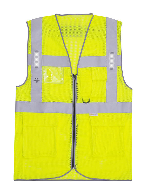 Gilet haute visibilité Multiples poches. Fermeture centrale à glissière. 2 poches plaquées à soufflet avec rabat fermé par auto-agrippant. Porte-badge translucide (10 x 7 cm). Poche portable avec compartiment stylo fermée par rabat. Anneau plastique D . | Bandes rétroréfléchissantes microbilles RETHIOTEX® 50 mm cousues + système LED.