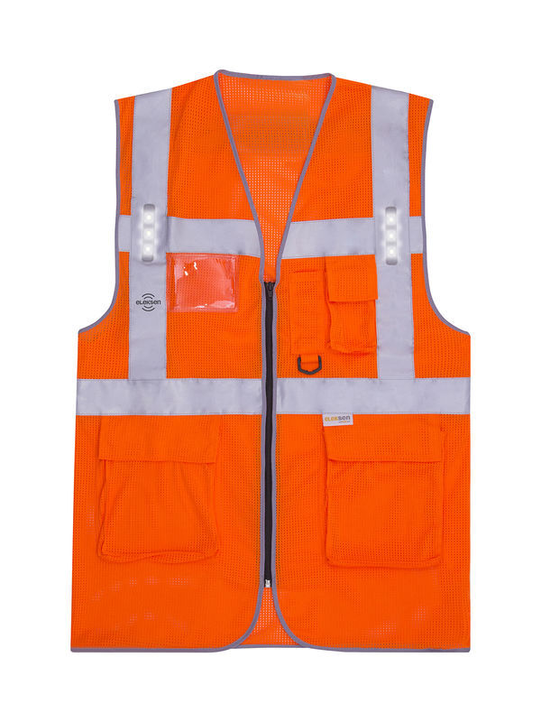 Gilet haute visibilité Multiples poches. Fermeture centrale à glissière. 2 poches plaquées à soufflet avec rabat fermé par auto-agrippant. Porte-badge translucide (10 x 7 cm). Poche portable avec compartiment stylo fermée par rabat. Anneau plastique D . | Bandes rétroréfléchissantes microbilles RETHIOTEX® 50 mm cousues + système LED.