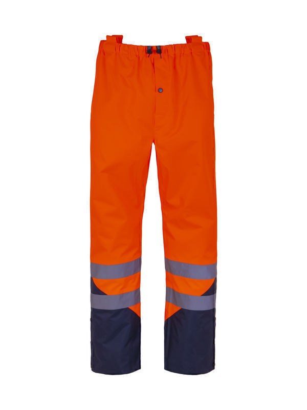 Pantalon haute visibilité. Ouverture braguette, fermée par bouton-pression. Ceinture élastiquée réglable par cordon de serrage et bloqueur. Passants au niveau de la ceinture avec auto-agrippant pour fixer les bretelles (en option). 2 passe-mains. Triangle d'aisance à l'entrejambe. Bas de jambes contrastés et fermés par 3 boutons-pression. 2 bandes rétroréfléchissantes en bas de jambe.