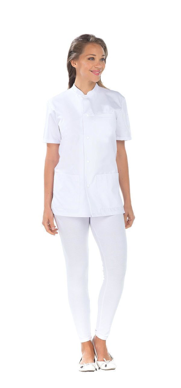 Tunique mixte. Fermeture milieu devant par boutons-pression. 2 poches basses. 1 poche BIP dans la poche gauche. Poche poitrine passepoilée. 1 poche stylo sur manche gauche. Manches courtes. Maille côtés, dos des manches et intérieur du col. Fentes dos. Longueur : 75 cm.