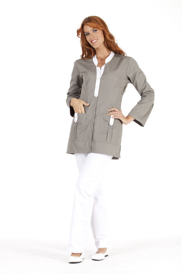 Tunique femme. Col officier fantaisie avec patte contrastée. Fermeture centrale par 5 pressions, dont 3 imitations boutons sur patte. Fentes côtés. 2 poches basses plaquées. Manches transformables avec pattes contrastées. Longueur : 80 cm.
