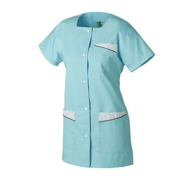 Tunique femme. Encolure carrée. Fermeture milieu devant par 5 boutons-pression blancs. Poche poitrine et 2 poches basses avec parements blancs et passepoil charbon. Fentes sur les côtés. Manches courtes kimono. Longueur : 75 cm.