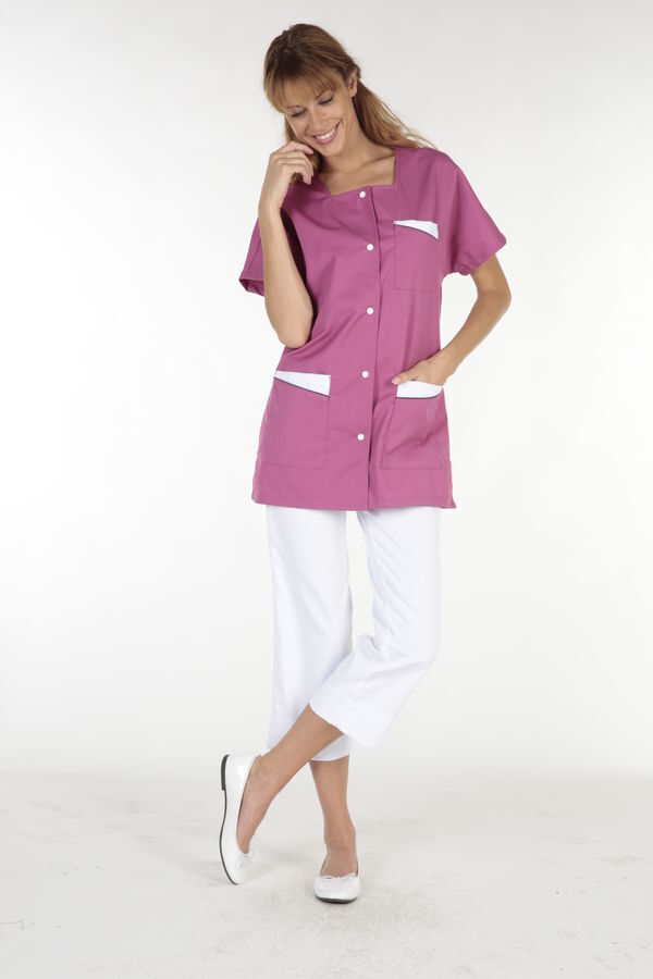 Tunique femme. Encolure carrée. Fermeture milieu devant par 5 boutons-pression blancs. Poche poitrine et 2 poches basses avec parements blancs et passepoil charbon. Fentes sur les côtés. Manches courtes kimono. Longueur : 75 cm.