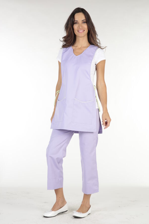 Chasuble femme. Encolure fantaisie ton sur ton. 2 poches basses plaquées avec passepoil contrasté. Fermetures côtés par lacets. Fentes côtés. Longueur : 75 cm.