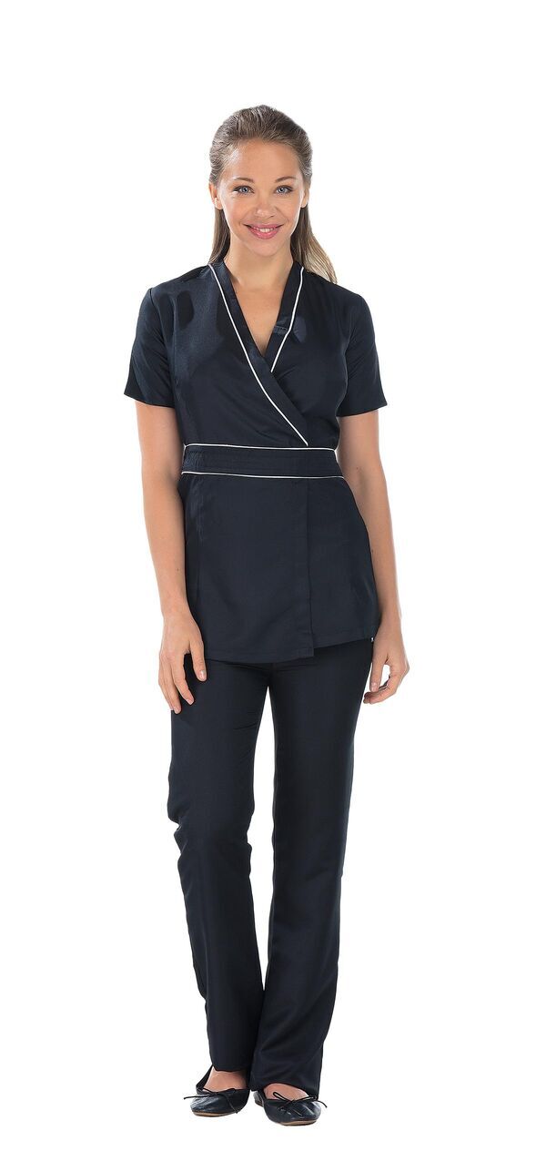 Passepoil contrasté à l'encolure et ceinture. Sans poche. Manches courtes.